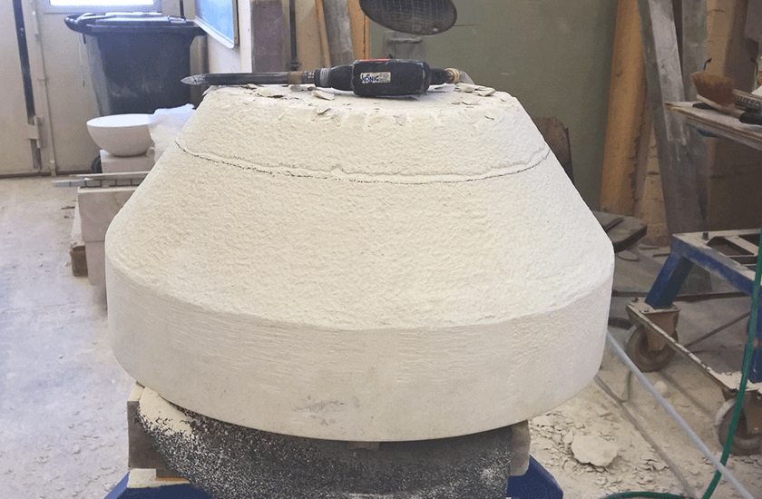 Als Stein diente ein französischer Kalkstein der in vielen Arbeitsschritten zunächst in Scheiben und Trommeln gearbeitet wurde. Danach wurden über Fasen die Rundung der Kugel an die einzelnen Teile an gearbeitet. Die Oberflächen wurden anschließend in mehreren Schritten geschliffen und poliert.